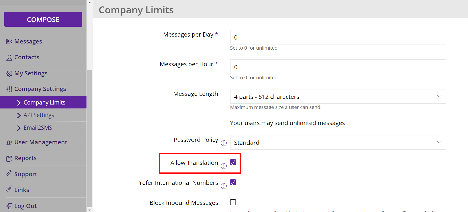 First, you'll need to allow Google Translate to be used by your organisation. To do this, go to Company Settings > Company Limits. From here, tick the 'Allow Translation' box, before scrolling to the bottom of the page and clicking Save.