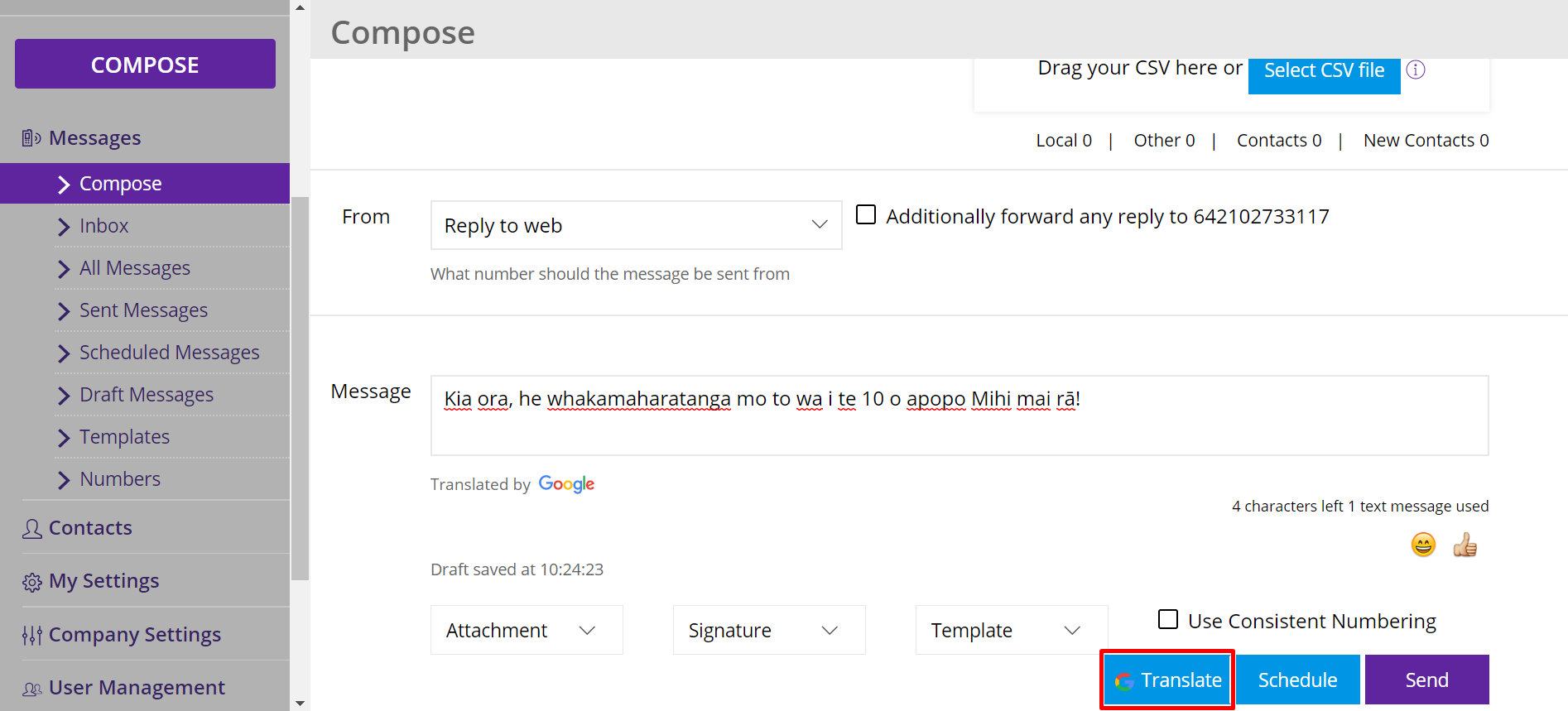 New Zealand is a culturally-diverse country. This means that when sending text messages out to your staff or customers, it's probable that you'll be contacting people that have English as a second language. So that you can ensure that all recipients can understand the messages you send, My A2P Message has a Google Translate feature. This feature makes contacting people that speak a language other than English easy. You can use the Google Translate feature to translate both messages you send, and replies that come through.