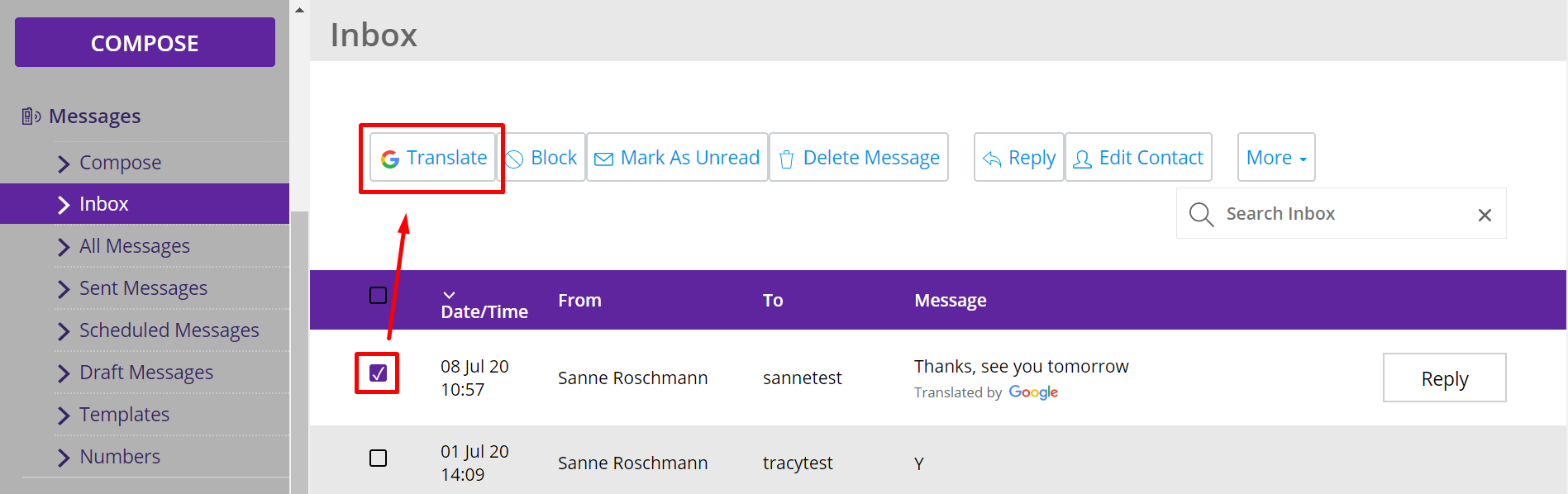 Once you've sent a message in another language, chances are that any replies you receive will come back in the same language. To translate a message reply, go to the Inbox and tick the box of the message(s) you'd like to translate, and a 'Translate' button should appear above the replies. Click the 'Translate' button and select the correct language from the dropdown. Your message will now appear in the selected language.