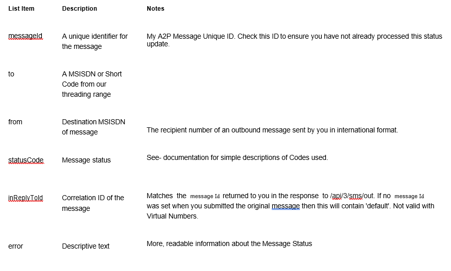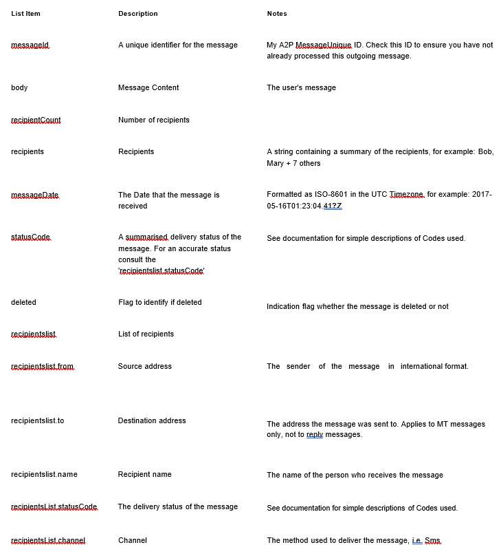 For 200 codes (success) My A2P Message will include JSON response containing some or all of message information as described below.