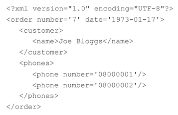 You can extract data from an element using {!order.customer.name}. Support for attributes in XML is dealt with via a hash, eg:
