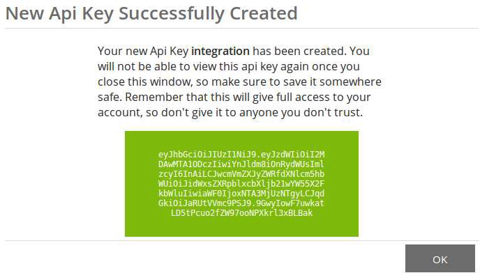 Make sure you copy the key to the clipboard, because you won't be able to access it again. Once you have generated an API Key you use it as a Bearer token in the HTTP Authorization header.
