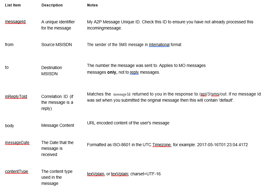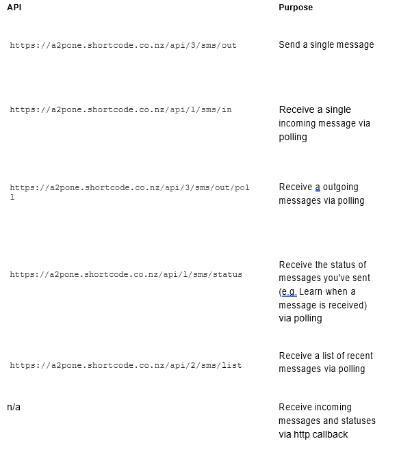 Use secure HTTPS GET or POST (recommended) to send messages to https://a2pone.shortcode.co.nz /api/3/ sms/out