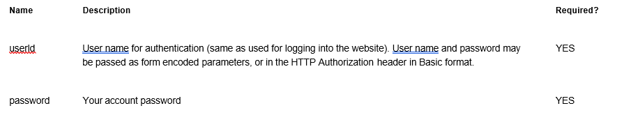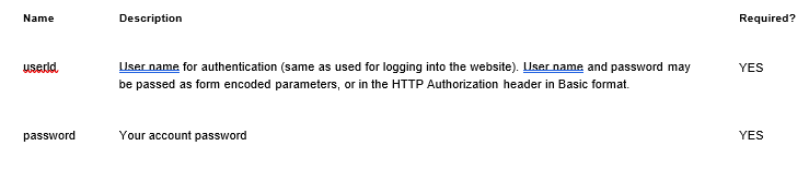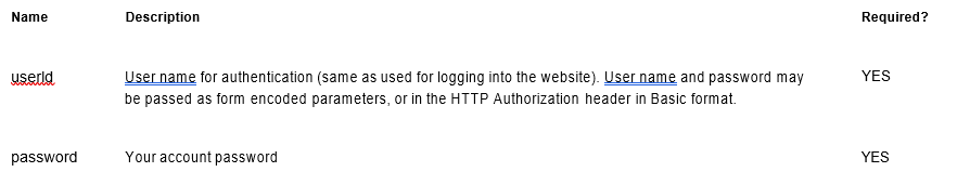 User name for authentication (same as used for logging into the website). User name and password may be passed as form encoded parameters, or in the HTTP Authorization header in Basic format. |